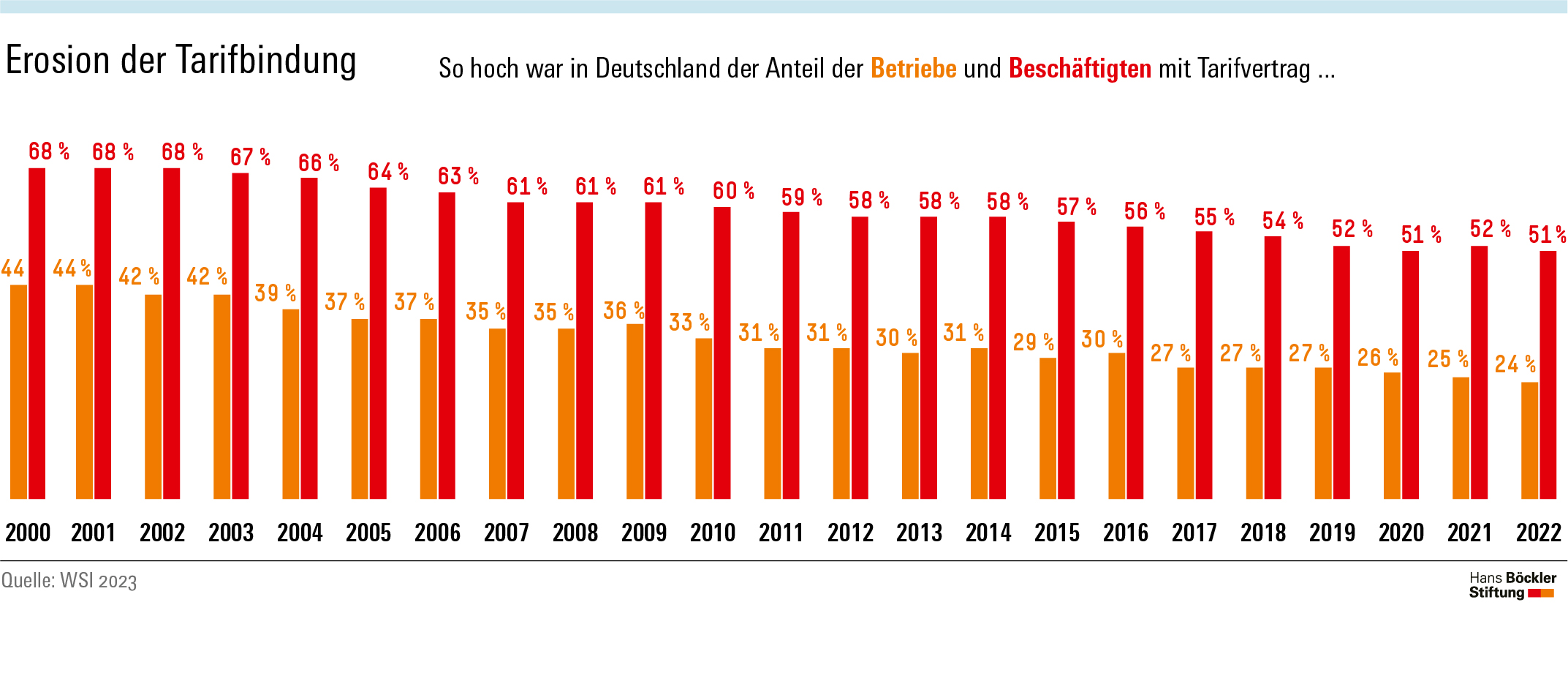 Die Tarifbindung hat in Deutschland massiv abgenommen. Waren im Jahr 2000 noch fast 70 Prozent der Beschäftigten bei tarifgebundenen Arbeitgebern beschäftigt, so ist es heute nur noch rund die Hälfte. Nur noch jeder vierte Betrieb ist tarifgebunden.