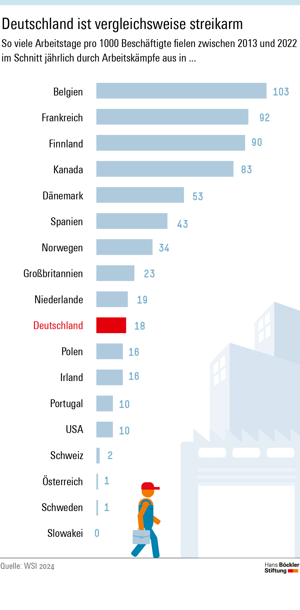 Internationaler Spitzenreiter in Sachen Streik ist Belgien mit jährlich im Schnitt 103 Ausfalltagen pro 1000 Beschäftigte. Deutschland liegt mit durchschnittlich 18 ausgefallenen Arbeitstagen im Mitelfeld.