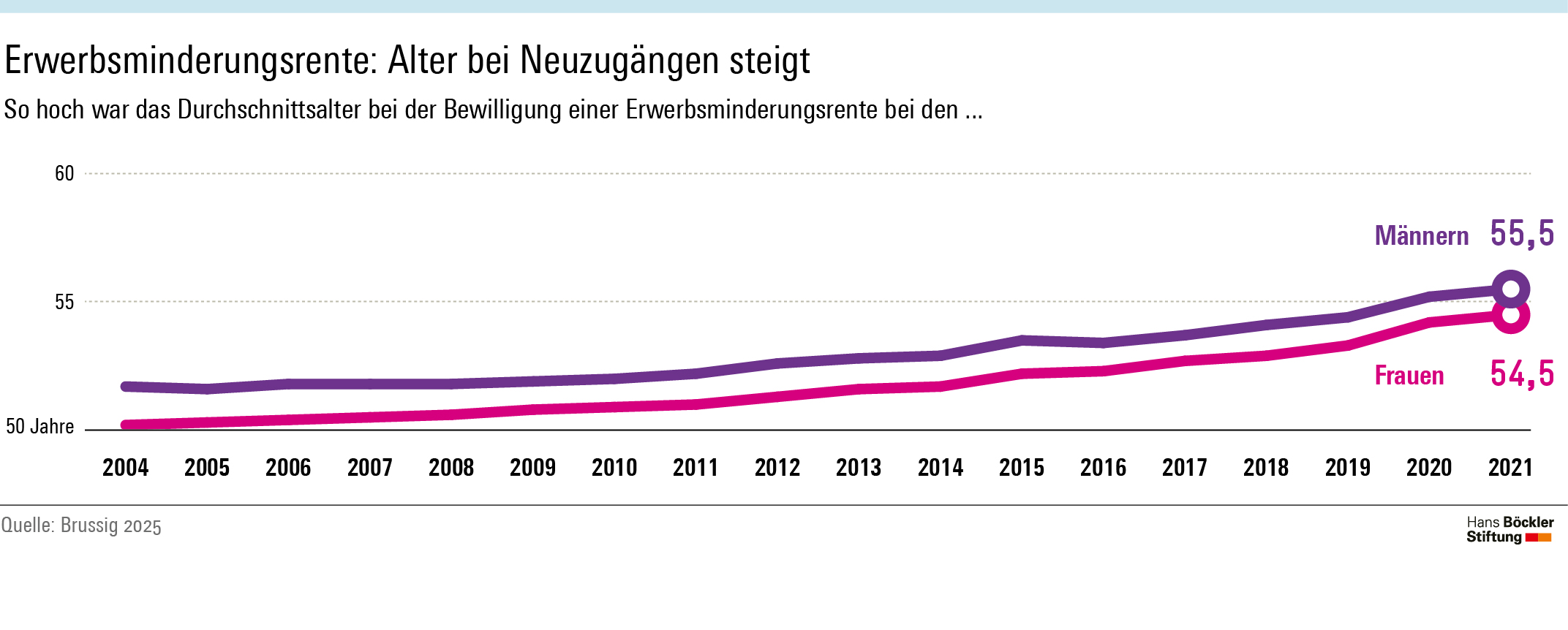 Infografik: Das Durchschnittsalter bei der Bewilligung einer Erwerbsminderungsrente betrug 2021 bei den Männern 55,5 Jahre, bei den Frauen 54,5 Jahre und war damit rund vier Jahre höher als 2004.