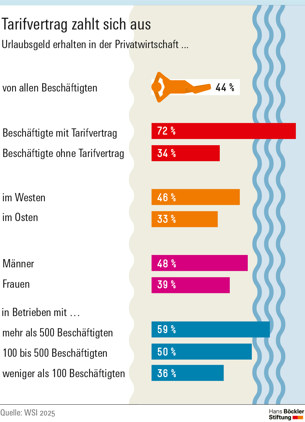 Infografik: In Betrieben mit Tarifvertrag bekommen 72 Prozent Urlaubsgeld, ohne Tarifbindung sind es nur 34 Prozent.