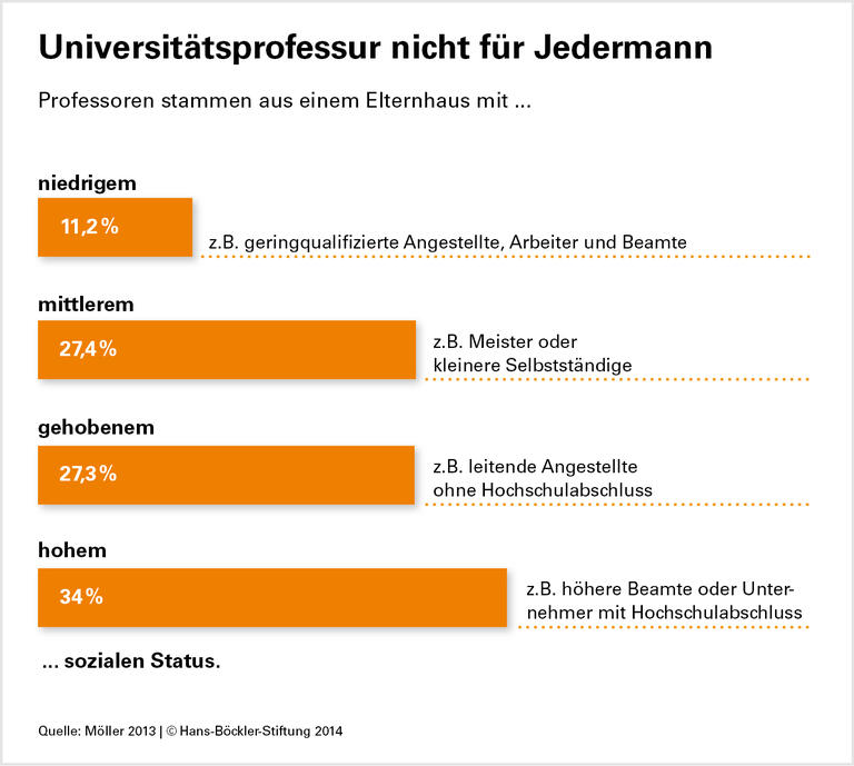 Von den 1950er- bis Mitte der 1980er-Jahre, schreibt Möller, also „in der Zeit, als die heutigen Professorinnen und Professoren im Kindheits- und Jugendalter waren“, hatte die Hälfte der männlichen Erwerbstätigen den Status von Arbeitern. Die leitenden Angestellten, höheren Beamten, akademischen Freiberufler und größeren Unternehmer – deren Kinder viel häufiger Professoren wurden – stellten nur wenige Hundertstel der Berufstätigen.
