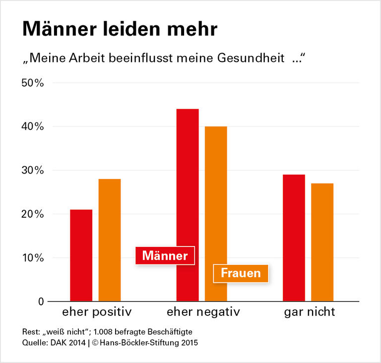 Fast die Hälfte der Beschäftigten klagt über gesundheitliche Belastungen durch Arbeit - Männer etwas mehr als Frauen. Zur Grafik