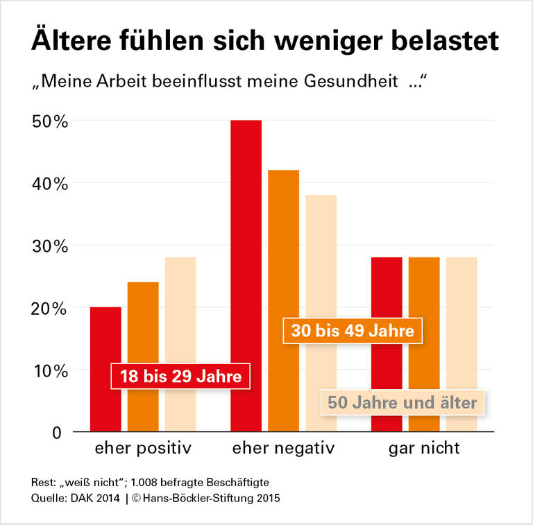 Rund 50 Prozent der 18- bis 29-Jährigen geben an, dass die Arbeit ihre Gesundheit negativ beeinflusst. Bei den Älteren fällt dieser Anteil geringer aus. Zur Grafik
