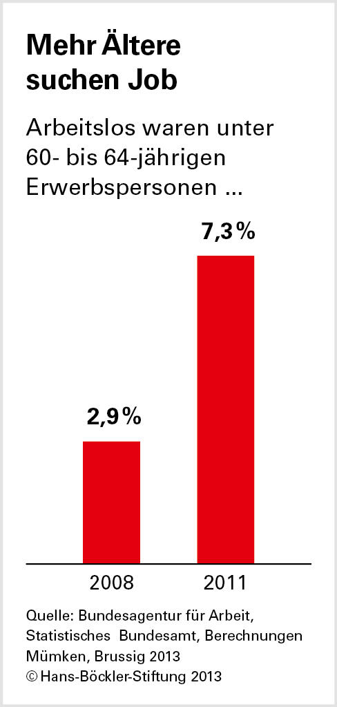 Sarah Mümken, Martin Brussig: Arbeitslosigkeit: Unter den 60- bis 64-Jährigen deutlich gestiegen, Altersübergangs-Report 1/2013.