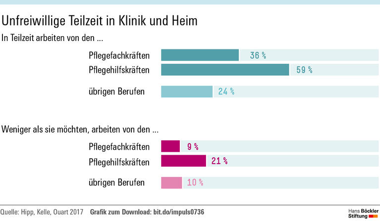 So kommt es, dass die Teilzeitquoten im Pflegesektor in vielen europäischen Ländern über dem Durchschnitt aller Beschäftigten liegen. Insbesondere die weniger qualifizierten Hilfskräfte erreichen oft nur geringe Stundenzahlen. In Deutschland arbeiten sie zu fast 60 Prozent in Teilzeit. Und mehr als 20 Prozent der Hilfskräfte würden gern länger arbeiten. Bei Fachkräften fallen die Zahlen niedriger aus.