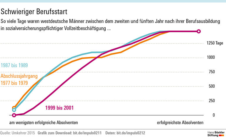 Umkehrer hat für seine Studie IAB-Daten zu den Erwerbsbiografien westdeutscher Männer ausgewertet, die zwischen 1977 und 2001 eine duale Ausbildung abgeschlossen haben. Dabei hat er sich auf Absolventen der Jahrgänge 1977 bis 1979, 1987 bis 1989 und 1999 bis 2001 konzentriert. Diese Kohorten sind nach seiner Einschätzung insofern vergleichbar, als sie zu einem ähnlichen Zeitpunkt im Konjunkturzyklus auf den Arbeitsmarkt gekommen sind, nämlich jeweils wenige Jahre vor einer Rezession.