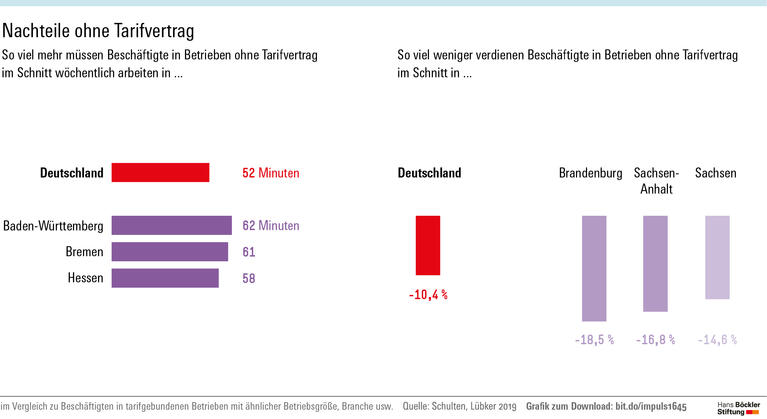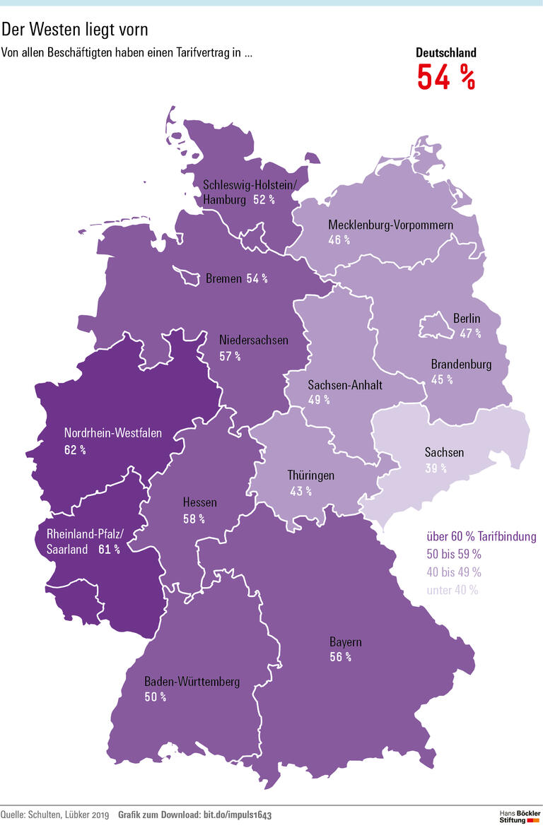 Malte Lübker, Thorsten Schulten: Tarifbindung in den Bundesländern. Entwicklungslinien und Auswirkungen auf die Beschäftigten (pdf), Elemente qualitativer Tarifpolitik Nr. 86, WSI, Oktober 2019