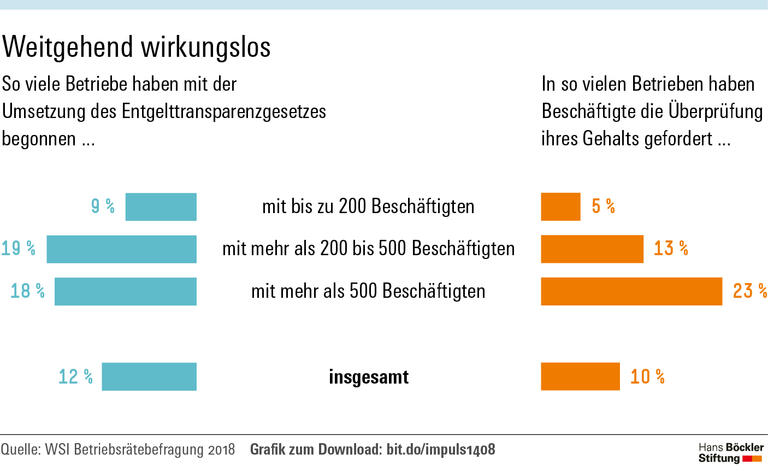 Auch die Beschäftigten zögern noch: In 13 Prozent der mittelgroßen Betriebe und 23 Prozent der großen Unternehmen haben sich Personen an den Betriebsrat gewandt, um ihr Gehalt überprüfen zu lassen. Die Wahrscheinlichkeit, dass Beschäftigte ihr Gehalt überprüfen lassen, steigt deutlich, wenn im Betrieb viele Hochqualifizierte arbeiten. Der Frauenanteil spielt dagegen keine Rolle.