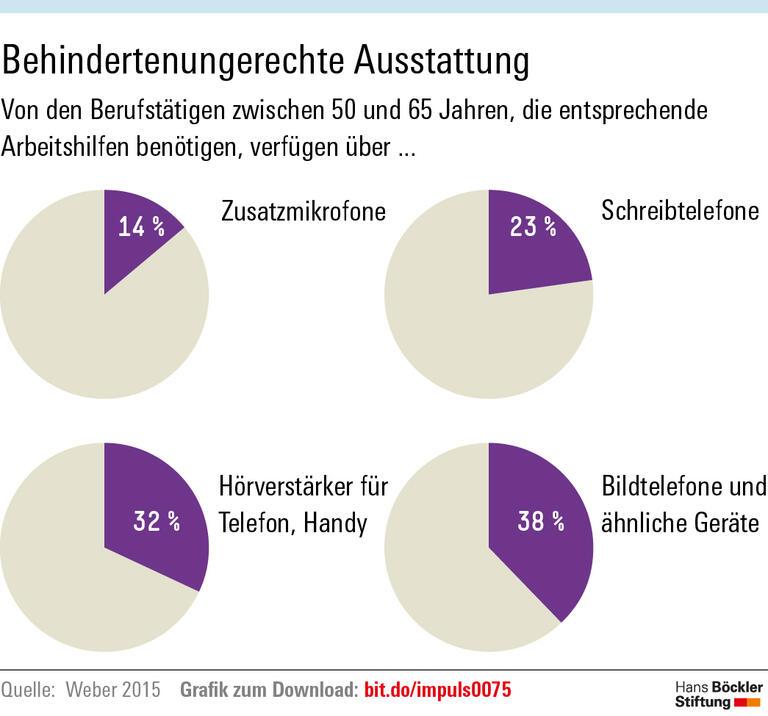 Ihren Arbeitsplatz insgesamt beurteilen lediglich 29,6 Prozent der Befragten als hörgeschädigtengerecht. Dass er mit allen erforderlichen technischen Hilfsmitteln ausgestattet ist, bejahen 28,4 Prozent. Gut ein Fünftel hält die Arbeitszeit für behindertengerecht, bei Arbeitsorganisation und Arbeitsumfeld sind es jeweils 15,7 Prozent. Von bevorzugter Behandlung bei der Weiterbildung – wie es der Gesetzgeber vorsieht – berichten 13,3 Prozent. Zwar sind über 86 Prozent mit den Lichtverhältnissen zufrieden, lediglich ein Drittel profitiert jedoch von Maßnahmen zur Lärmminderung. Ähnlich sieht es bei den technischen Arbeitshilfen aus: Fax, Internet und Mobiltelefone für SMS-Kommunikation stehen der überwiegenden Mehrheit zur Verfügung. Ein spezielles Telefon für Hörgeschädigte gibt es dagegen nur für 40,1 Prozent derjenigen, die ein solches Gerät benötigen würden. Ein Zusatzmikrofon erhalten nur 13,6 Prozent. Alles in allem seien die gesetzlich vorgesehenen Maßnahmen bislang in eher geringem Maße umgesetzt, resümieren die Autoren. Auch angesichts des wachsenden Anteils älterer Arbeitnehmer seien zusätzliche Anstrengungen dringend geboten.
