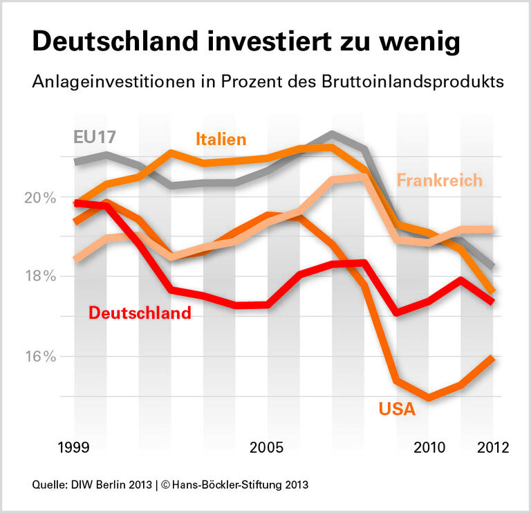 Für ihre Untersuchung haben die Ökonomen zahlreiche Statistiken ausgewertet. Sie dokumentieren, dass Deutschland bei den Ausgaben für die Zukunft hinterherhinkt. So sank die Investitionsquote, also das Verhältnis aller Bruttoinvestitionen zum Bruttoinlandsprodukt (BIP), seit 1999 von knapp 20 auf rund 17 Prozent. Besonders investitionsschwach ist der Staat. Seine Investitionsquote lag seit dem Jahr 2000 konstant unter 2 Prozent des BIP. im Jahr 2011 betrug sie 1,6 Prozent. Im Euroraum investierte die öffentliche Hand im Durchschnitt dagegen 2,3 Prozent. Ebenso viel gab der amerikanische Staat aus, in Japan oder Australien waren es deutlich mehr als 3 Prozent. Die Zurückhaltung geht an die Substanz: Nach Abzug aller Verbindlichkeiten betrug das staatliche Nettovermögen, zu dem unter anderem die öffentliche Infrastruktur zählt, 1999 etwa 20 Prozent des BIP. 2011 waren es nur noch 0,5 Prozent.