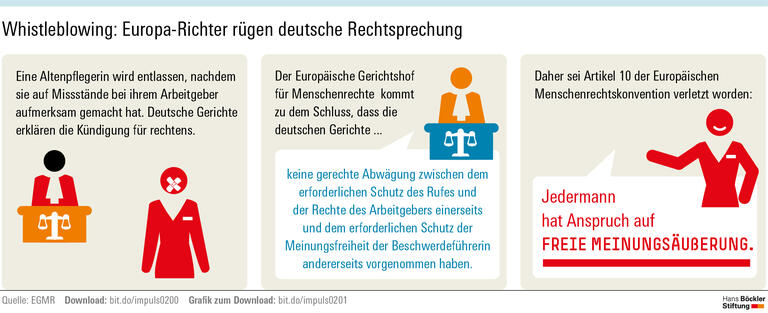 Mückenberger räumt ein, dass sich der Citizenship-­at-work-Ansatz kaum von heute auf morgen umsetzen ließe. Er stelle aber einen wichtigen strategischen Orientierungspunkt für die Weiterentwicklung des Arbeitsrechts dar. Insbesondere das Thema Whistleblowing verlange nach einer rechtlichen Klarstellung, wie ein Fall aus der jüngeren Vergangenheit zeigt: Eine Altenpflegerin hatte ihren Arbeitgeber wegen unhaltbarer Zustände im personell unterversorgten Heim angezeigt und war daraufhin entlassen worden. Die deutsche Rechtsprechung bestätigte die Kündigung. Der Europäische Gerichtshof für Menschenrechte hob die Entscheidung jedoch auf und sprach der Klägerin eine Entschädigung zu. Darin sieht Mückenberger eine „Steilvorlage“ für die Gewerkschaften. Das Konzept des Bürgers am Arbeitsplatz sei ein wichtiger Baustein für die Weiterentwicklung der Mitbestimmung.