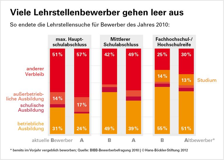 Insgesamt gebe es jedes Jahr „Hunderttausende, die keine Ausbildungsstelle gefunden haben“, konstatieren die Wissenschaftler. 2010 waren es rund 175.000 Jugendliche, die sich letztlich mit einem Alternativprogramm wie einer außerbetrieblichen Ausbildung abfanden, und knapp 110.000, „deren Verbleib ungeklärt“ blieb.