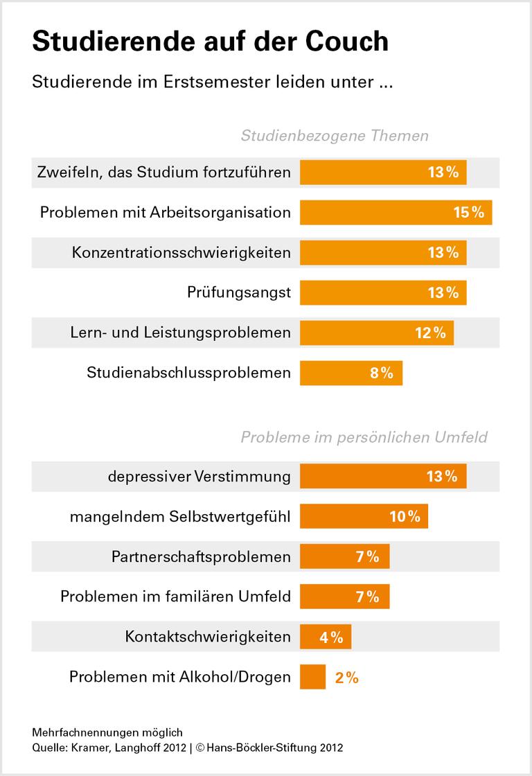 Studium: Studierende haben in der Regel recht gute Arbeitsmarktchancen, wie sich an der geringen Akademikerarbeitslosigkeit ablesen lässt. Allerdings gibt es auch hier Ausnahmen, zeigen Kramers und Langhoffs Analysen. So hat ein Jahr nach Studienende nur rund die Hälfte der Geisteswissenschaftler eine reguläre Arbeit gefunden. Die größeren Schwierigkeiten bereite der Mehrheit jedoch das Studium selbst. „Der ökonomische, soziale, Leistungs- und Zeitdruck sind enorm gestiegen“, stellen die Forscher fest. Zwei Drittel arbeiteten neben dem Studium für den Lebensunterhalt. Das führe zu „enormen Mehrfachbelastungen“. Mit der Einführung der Bachelor-Studiengänge sei zudem die Zahl der Klienten in den psychologischen Beratungsstellen um 20 Prozent angestiegen. Studierende sind nach einer Untersuchung der Betriebskrankenkassen zwar im Schnitt gesünder als Gleichaltrige, eine Ausnahme bilden aber die psychischen Erkrankungen: Studentinnen und Studenten bekommen deutlich häufiger Antidepressiva verschrieben.