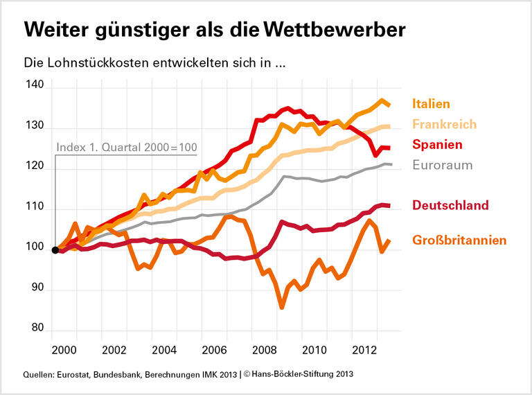 Seit Ausbruch der Krise im Euroraum sind die Arbeitskosten in den Krisenländern teilweise erheblich gesunken. Eine nachhaltige Erholung ganz Europas fiele leichter, wenn die Löhne in Deutschland für eine absehbare Zeit deutlich zulegten.