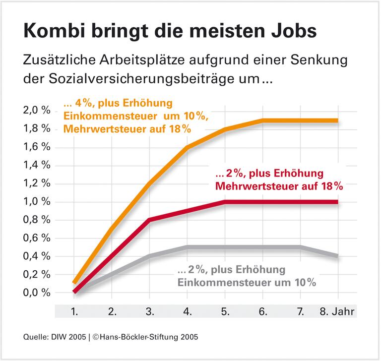 Insgesamt geht es um 83,7 Milliarden Euro. Diese Summe geben die Sozialversicherungen heute für Leistungen aus, die eigentlich nicht ihre Aufgabe sind, sondern von der Allgemeinheit getragen werden müssten (siehe dazu auch Böckler Impuls Nr. 6 und 7). Mehrere Varianten einer - zumindest teilweisen - Steuerfinanzierung dieser Leistungen hat das DIW durchgerechnet. Die Ergebnisse sind eindeutig: Am meisten Erfolg verspricht die Kombination aus einer Erhöhung der Mehrwert- und einem zehnprozentigen Aufschlag zur Einkommensteuer, ähnlich dem Solidaritätszuschlag.