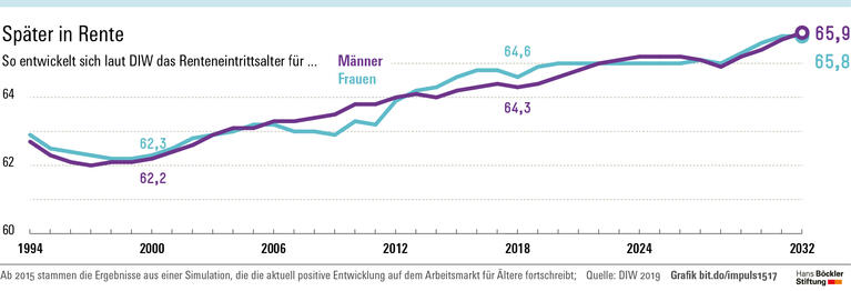 Länger arbeiten, später in den Ruhestand – darauf müssen sich die Menschen einstellen. Das tatsächliche Renteneintrittsalter, das aktuell im Schnitt bei gut 64 Jahren liegt, wird bis zum Beginn der 2030er-Jahre um bis zu anderthalb Jahre ansteigen. Das zeigt eine aktuelle Prognose des DIW, gefördert von der Hans-Böckler-Stiftung. Das wesentliche Ziel der Rente mit 67, nämlich die Verlängerung der Lebensarbeitszeit, wäre damit erreicht. Aber: „Den entlastenden fiskalischen Wirkungen stehen große sozialpolitische Risiken gegenüber“, schreiben die DIW-Wissenschaftler.