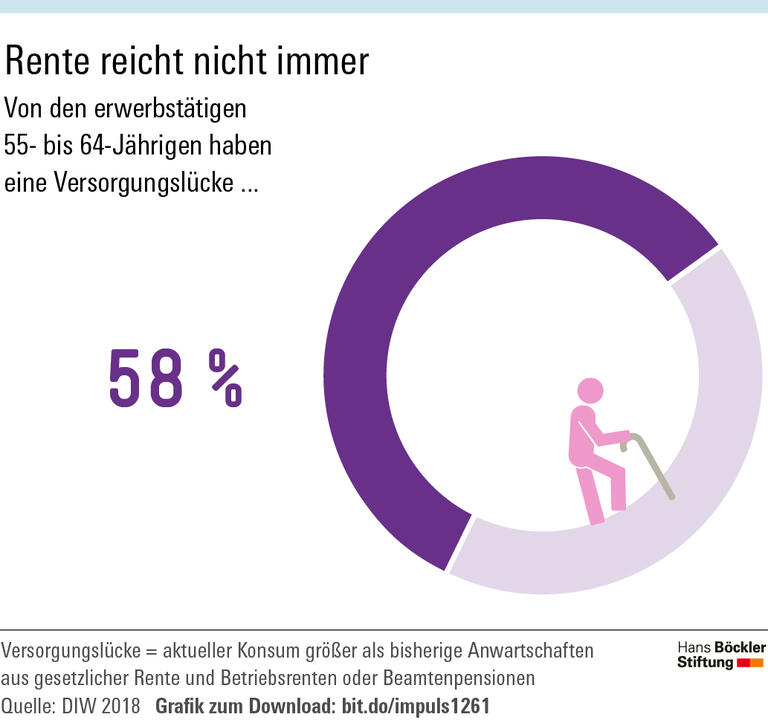 Wenn man annimmt, dass die untersuchten Erwerbstätigen durchgängig bis zum durchschnittlichen Renteneintrittsalter in ihrer bisherigen Position weiterarbeiten können, sinkt der Anteil der Betroffenen. Doch auch dann müssen von den Ruheständlern, die Geld aus gesetzlicher und betrieblicher Rente bekommen, 50 Prozent ihren Konsum einschränken. Rechnet man Leistungen aus privaten Versicherungen hinzu, sind es 48 Prozent.