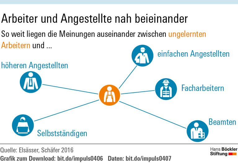 Zwischen den Berufsgruppen – ungelernte Arbeiter, Facharbeiter, einfache Angestellte, qualifizierte Angestellte, Selbstständige und Beamte – stellen die Forscher deutliche Meinungsunterschiede fest. Ungelernte Arbeiter und Selbstständige liegen am weitesten auseinander, die Werte für Zustimmung beziehungsweise Ablehnung unterscheiden sich bei vielen Fragen um 20 bis 30 Prozentpunkte, in einigen Fällen um bis zu 50 Prozentpunkte. Besonders groß sind die Unterschiede in Fragen der Arbeitsmarkt- und Sozialpolitik. Beispiel: Dass die Bundesbahn privatisiert werden soll, befürworteten Anfang der 1990er-Jahre nur 30 Prozent der ungelernten Arbeiter, bei den qualifizierten Angestellten und Beamten betrug die Zustimmung dagegen fast 60 Prozent, unter den Selbstständigen rund 70 Prozent. Dagegen kommen völlig unterschiedliche Auffassungen zwischen ungelernten Arbeitern und Facharbeitern selten vor. „Die Befragten innerhalb einer sozialen Klasse sind in ihren Einstellungen systematisch ähnlicher als Befragte aus unterschiedlichen sozialen Klassen“, schreiben Elsässer und Schäfer.