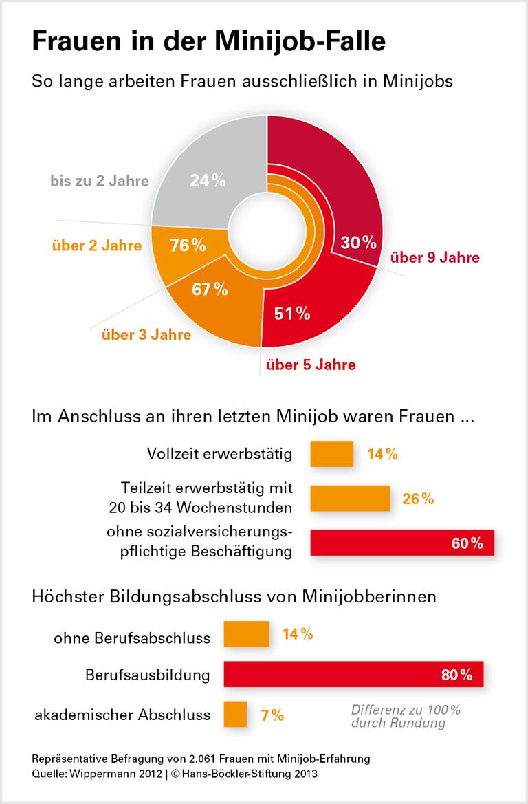 Mit zunehmender Dauer im Minijob merken Frauen, dass sie nicht mehr als qualifizierte Fachkraft gelten. 44 Prozent der ehemaligen Minijobberinnen haben diesen Eindruck. So wird die Hürde zu einer regulären Teilzeit- oder Vollzeitstelle immer höher – „ein Programm zur Erzeugung lebenslanger ökonomischer Ohnmacht und Abhängigkeit von Frauen“, fasst Wippermann zusammen. Vieles spreche dafür, dass ohne die Privilegierungen der Minijobs – beitragsfreie Krankenversicherung über den Partner, Befreiung von Steuern und Sozialabgaben – Frauen im Minijob eine sozialversicherungspflichtige Beschäftigung mit gleicher oder leicht höherer Stundenzahl angenommen hätten. Dann ließen sich Arbeitszeit und Verdienst später leichter aufstocken.