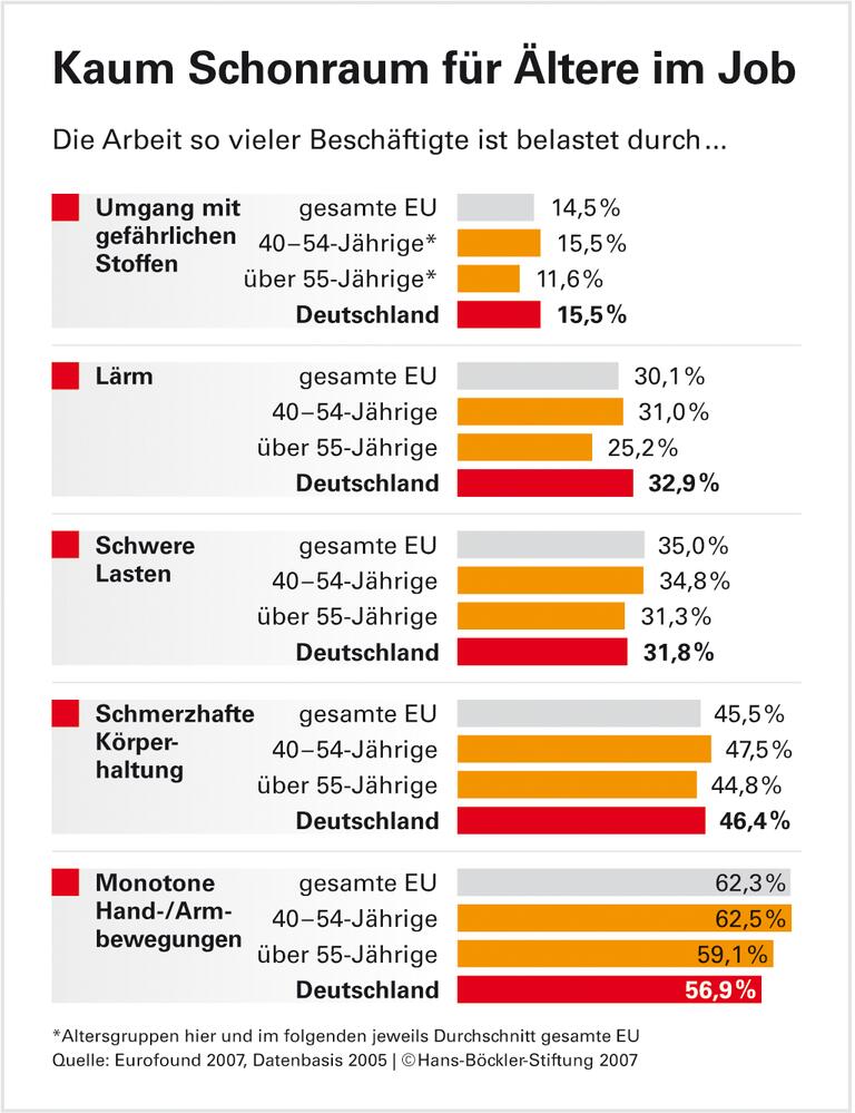 Körperliche Belastungen. Lärm, schmerzhafte Körperhaltungen, Kontakt mit Gefahrstoffen - solche Arbeitsbedingungen sind in der EU noch weit verbreitet. Auch Computerarbeit belastet den Körper durch ständig wiederholte Bewegungen oder Bewegungsmangel. Die Folgen sind breit gefächert: Studien weisen bei Beschäftigten, die länger als fünf Jahre starkem Lärm ausgesetzt sind, erhöhte Blutdruckwerte nach. Arbeitnehmer, die täglich mehr als 15 Mal eine Last über 25 Kilogramm heben müssen, tragen ein deutlich erhöhtes Risiko, länger als sieben Tage krankgeschrieben zu werden. Wer im Job dauernd sitzt und in der Freizeit keinen Bewegungs-Ausgleich schafft, muss nach zehn Jahren mit einer um 90 Prozent erhöhten Herzinfarktgefahr leben. Und wer mehr als drei Viertel seines Arbeitstages den Computer benutzt, verdreifacht das Risiko, dass Nacken, Schulter oder Hand schmerzen.