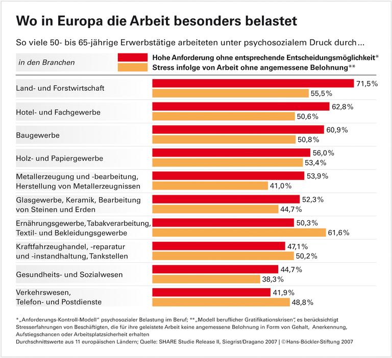 Psychosoziale Arbeitsbelastungen. Wissenschaftler haben mehrere Modelle konstruiert, um solche Belastungen von "normalem" Stress abzugrenzen. Das "Anforderungs-Kontroll-Modell" erfasst Berufstätige, an die hohe Anforderungen gestellt werden, ohne dass sie entsprechende Entscheidungsmöglichkeiten hätten. Das "Modell beruflicher Gratifikationskrisen" berücksichtigt Stresserfahrungen von Beschäftigten, die für ihre geleistete Arbeit keine angemessene Belohnung in Form von Gehalt, Anerkennung, Aufstiegschancen oder Arbeitsplatzsicherheit erhalten. Auf der Basis deutscher und europäischer Untersuchungen gehen Siegrist und Dragano davon aus, dass im Schnitt etwa 20 Prozent der Beschäftigten psychosozial belastet sind - mit deutlich höheren Werten in Branchen wie der Land- und Forstwirtschaft, der Metallerzeugung, dem Kraftfahrzeughandel oder bei personenbezogenen Dienstleistungen, etwa im Gesundheitswesen. Und: Wer im Job psychosozialem Druck ausgesetzt ist, kann schon deswegen krank werden. Besonders gefährlich ist aber die Kombination von körperlichen und psychosozialen Belastungen.