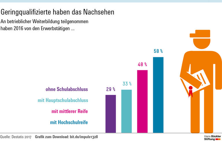 Berufsbegleitendes Lernen sei einer der Schlüssel dafür, die Chancen der Digitalisierung wirksam in mehr Produktivität und Innovationen umzumünzen, heißt es in dem Papier. Dabei sei zunächst und vor allem die Wirtschaft am Zug: Unternehmen sollten berufsbegleitende Weiterbildung strategisch fördern. Das erfordere Wertschätzung durch das Management, die Gestaltung lernförderlicher Arbeitsbedingungen sowie die Einrichtung von Experimentierzonen. Die Beschäftigten sollten dabei die Möglichkeit haben, den Wandel selbstbestimmt mitzugestalten. Die Autoren sprechen sich dafür aus, Betriebsräte bereits bei der Planung und Entwicklung zukunftsfähiger Bildungskonzepte aktiv zu beteiligen. Das führe zu mehr Motivation und mache die Umsetzung leichter.