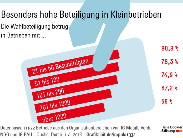 Die Vertretung ihrer Interessen im Betrieb ist den Menschen ähnlich wichtig wie die Zusammensetzung der Parlamente. Bei den Betriebsratswahlen 2018 haben im Durchschnitt der Betriebe, in denen gewählt wurde, gut 75 Prozent der Beschäftigten ihre Stimme abgegeben, gemessen an allen Wahlberechtigten gingen 66 Prozent zur Wahl. Hintergrund: In kleineren Betrieben – der Mehrheit – ist die Beteiligung am höchsten. In der Größenklasse 21 bis 50 Beschäftigte betrug die Quote über 80 Prozent; bei 51 bis 100 Beschäftigten lag sie über 78 Prozent. In Großbetrieben mit mehr als 1 000 Beschäftigten, die besonders häufig und oft schon lange einen Betriebsrat haben, gingen 59 von 100 Beschäftigten zur Wahl. Gegenüber der letzten Abstimmung vor vier Jahren sank die Wahlbeteiligung geringfügig um rund drei Prozentpunkte. Dies geht aus dem vorläufigen Trendreport Betriebsratswahlen 2018 hervor, den Wissenschaftler von der Universität Marburg im Auftrag der Hans-Böckler-Stiftung erstellt haben. Die Auswertung basiert auf den Wahlergebnissen von gut 18 000 Betrieben.