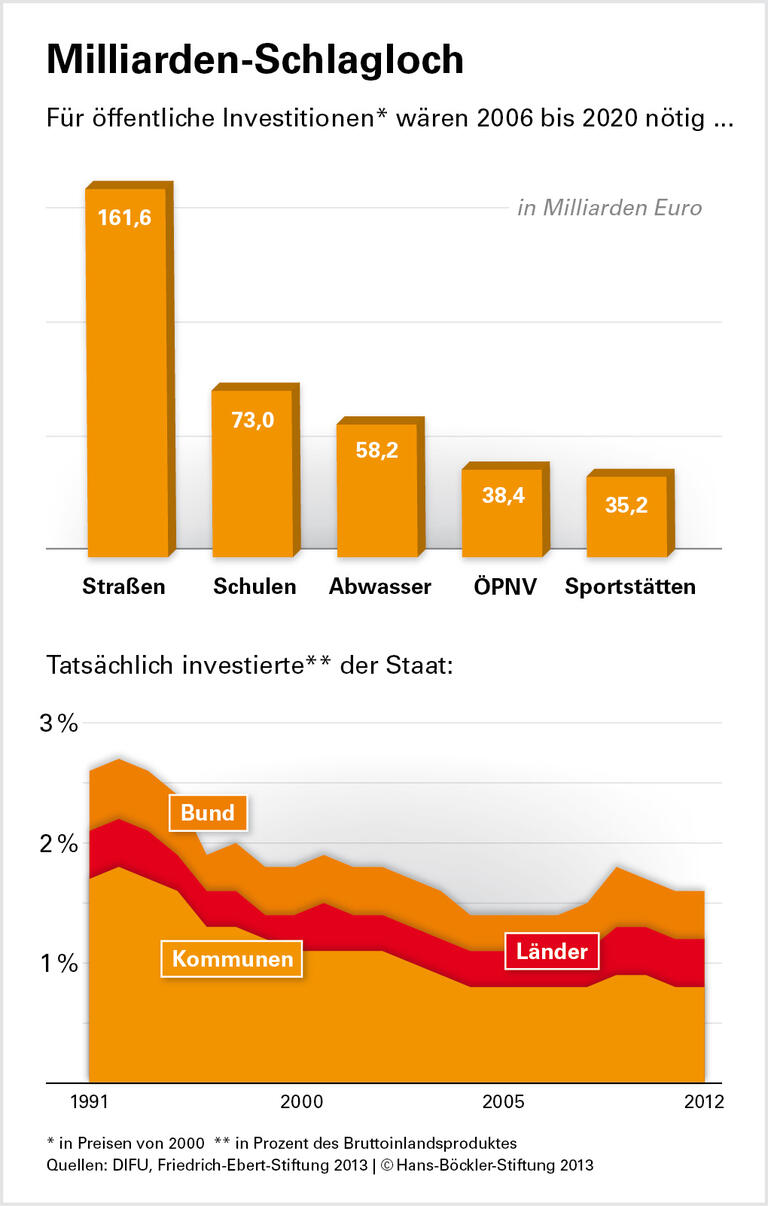 Seit 1991 hat sich der Anteil der kommunalen Investitionen an der Wirtschaftsleistung halbiert; allein zwischen 2003 und 2012 ist dadurch eine Investitionslücke von 52 Milliarden Euro entstanden. Zur Grafik