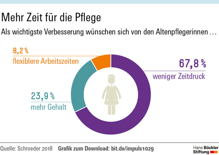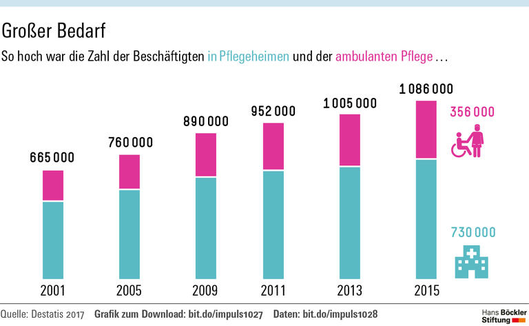 Allein zwischen 1999 und 2015 ist die Zahl der Beschäftigten in der Altenpflege um 460 000 auf knapp 1,1 Millionen gestiegen. 65 Prozent der Stellen sind Teilzeitjobs, so viel wie in kaum einem anderen Wirtschaftszweig. 85 Prozent der Beschäftigten sind auch heute noch Frauen. Umfragen zeigen: Es fehlt vielfach an guten Arbeitsbedingungen, worunter die Attraktivität des Berufs leidet. 2012 erwarteten drei Viertel der Beschäftigten in der Altenpflege, ihren Beruf nicht bis zum gesetzlichen Rentenalter ausüben zu können. Das Spektrum der Qualifikationen ist breit, für eine gute Pflege benötigt man gut qualifiziertes Personal in ausreichender Anzahl. Auch das Arbeitgeberlager ist alles andere als einheitlich: Von privaten Firmen über den öffentlichen Dienst, freie Wohlfahrtsverbände und kirchliche Träger ist alles dabei.