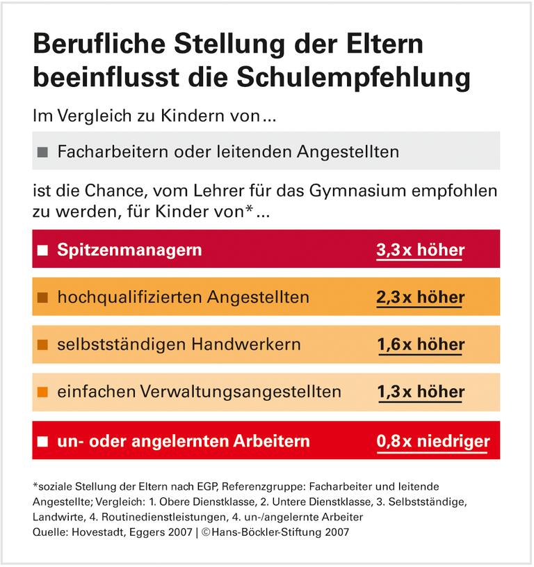 In Deutschland ist die Grundschule die einzige Schulform, die alle Kinder gemeinsam besuchen. Am Ende der Grundschulzeit sind die Leistungen noch nicht so stark von der sozialen Herkunft bestimmt wie zum Ende der Schulpflicht. Nach der vierten Klasse erfolgt in der Regel die entscheidende Weichenstellung. 2001 empfahlen die Lehrer 29,3 Prozent den Gang auf die Hauptschule, 35,7 Prozent die Realschule, 34,9 Prozent das Gymnasium. Über 10-Jährige faire Prognosen zu treffen, ist schwierig. Die Forschung beobachtet einen klaren Einfluss der sozialen Herkunft eines Kindes auf die Empfehlungen - sogar ungeachtet der tatsächlichen Leistung. Im Durchschnitt müssen Kinder aus unteren Schichten bessere Leistungen bringen, um ebenso gute Empfehlungen zu bekommen wie die anderen. Die internationale Vergleichsstudie IGLU zeigte: Bei gleichen kognitiven Grundfähigkeiten und Lesekompetenzen haben Kinder aus höheren Schichten eine 2,7-fach größere Chance, eine Empfehlung für das Gymnasium zu erhalten als Kinder aus Facharbeiter-Familien. Bei der Studie LAU 5 wurde zudem deutlich: Ein Kind, dessen Vater keinen Schulabschluss hat, muss erheblich besser sein als die anderen, um eine Empfehlung für ein Gymnasium zu bekommen. Es muss ein genauso hohes Leistungsniveau aufweisen wie ein Schüler, der eine Klasse überspringen darf. Hat der Vater Abitur, genügt schon eine Leistung unter dem Durchschnitt.