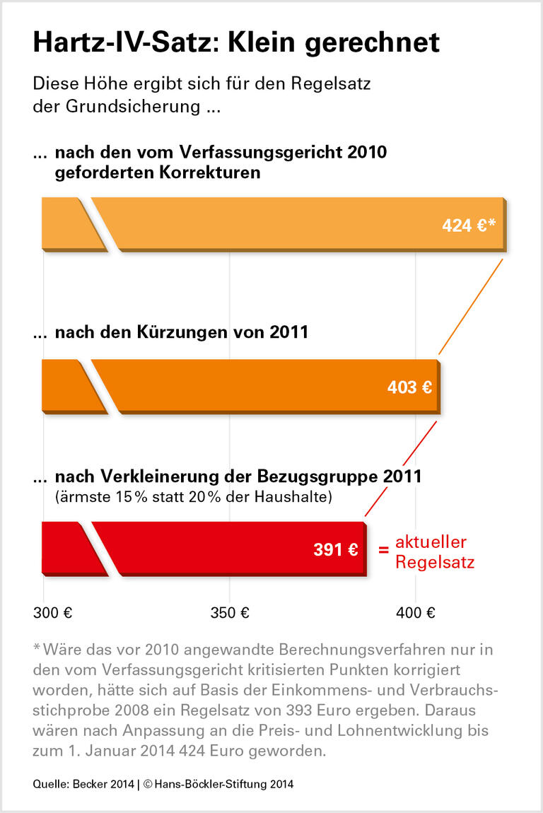 Willkürliche Kürzungen höhlen das Berechnungsmodell aus. Eigentlich müssten nahezu alle vom Statistischen Bundesamt ermittelten Ausgaben der Bezugshaushalte (außer für die im Hartz-IV-Fall extra bezahlte Warmmiete) zur Bestimmung des Regelsatzes herangezogen werden, um dem Grundgedanken des Statistikmodells gerecht zu werden. Tatsächlich kann der Gesetzgeber aufgrund „normativer Setzungen“ bestimmte Konsumkategorien aber für irrelevant erklären. Er tut das zum Beispiel bei Tabakwaren und alkoholischen Getränken, Schnittblumen oder chemischer Reinigung. Diese Möglichkeit führte – in Kombination mit der veränderten Abgrenzung der Bezugsgruppe – dazu, dass der Regelsatz bei der Neuregelung 2011 kaum stieg. Zwar hatte das Bundesverfassungsgericht darauf gedrungen, dass bestimmte Bedarfsfelder wie Mobilität stärker berücksichtigt werden. Doch das Arbeitsministerium kürzte im Gegenzug an anderen Stellen, so dass am Ende ein beinahe unveränderter Hartz-IV-Satz herauskam. Becker und Schüssler mahnen daher an, die „freihändige“ Umsetzung – eine Formulierung aus dem Urteil des Verfassungsgerichts von 2010 – des Statistikmodells müsse „grundsätzlich verändert werden“.