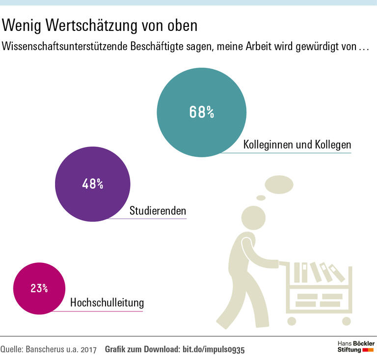 Insgesamt halten die Autoren der Studie fest: „Die geringe Vergütung und die ungenügenden Entwicklungsmöglichkeiten werden von den befragten Beschäftigten auch als fehlende Wertschätzung ihrer Arbeit und als demotivierend empfunden.“ Insbesondere auf den Leitungsebenen der Hochschulen werde die Arbeit des wissenschaftsunterstützenden Personals kaum gewürdigt, kritisieren viele Befragte. Nur 23 Prozent fühlen sich von der Führung wertgeschätzt, während 68 Prozent angeben, sie erführen Anerkennung von ihren Kollegen. Viele nehmen außerdem eine Veränderung des Klimas wahr: Jüngere wissenschaftliche Mitarbeiter und Studierende würden ihnen „fordernder“ gegenübertreten als früher üblich.