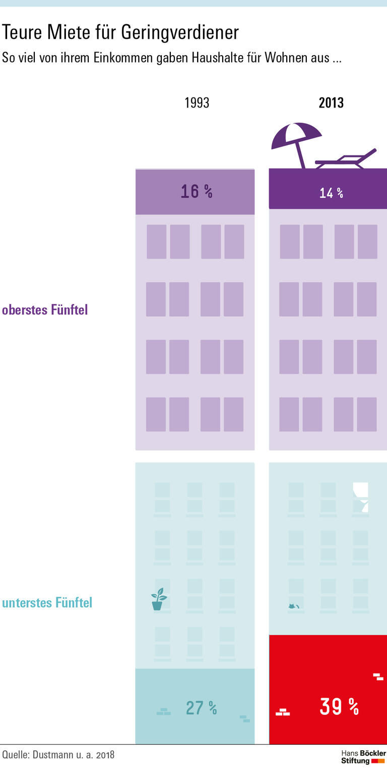 Wie sehr sich die Lage am Wohnungsmarkt für Menschen mit geringen Einkommen verschlechtert hat, lässt sich daran ablesen, welchen Anteil die Miete an den Gesamtausgaben eines Haushalts hat. Das nach Einkommenshöhe unterste Fünftel der Haushalte gab in den 1990er-Jahren etwa 25 Prozent seines Geldes für die Miete aus, zeigen die Forscher. Inzwischen sind es fast 40 Prozent.