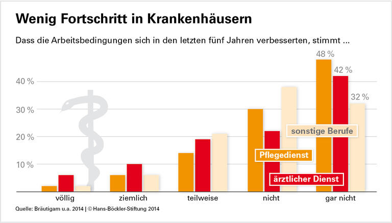 Die Zeichen der Knappheit sind nicht zu übersehen: 37 Prozent der Krankenhäuser haben nach einer aktuellen Umfrage des Deutschen Krankenhausinstituts akute Probleme, genug Pflegefachkräfte zu finden. Drei von vier Einrichtungen berichten von Schwierigkeiten, wenn es um die Einstellung von Ärzten geht. Nach knapp zwei Jahrzehnten, in denen Stellen gestrichen wurden, müssen Deutschlands Krankenhäuser einiges für ihre Wettbewerbsfähigkeit auf dem Arbeitsmarkt tun. Wie sich vor diesem Hintergrund die Arbeitsorganisation und Arbeitsbedingungen entwickeln, haben Josef Hilbert, Michaela Evans, Christoph Bräutigam und Fikret Öz vom Institut Arbeit und Technik (IAT) der Westfälischen Hochschule Gelsenkirchen untersucht. Das von der Hans-Böckler-Stiftung geförderte Forschungsprojekt stützt sich auf eine umfangreiche Online-Befragung, an der sich mehr als 2.500 Krankenhausbeschäftigte beteiligt haben: neben Pflegekräften – sie stellen die größte Gruppe – und Ärzten auch Physiotherapeuten, Sozialarbeiter und medizinische Fachangestellte. Die Befragung ist nicht repräsentativ, vermittelt nach Einschätzung der Wissenschaftler aber einen guten Eindruck von der Situation in deutschen Krankenhäusern.