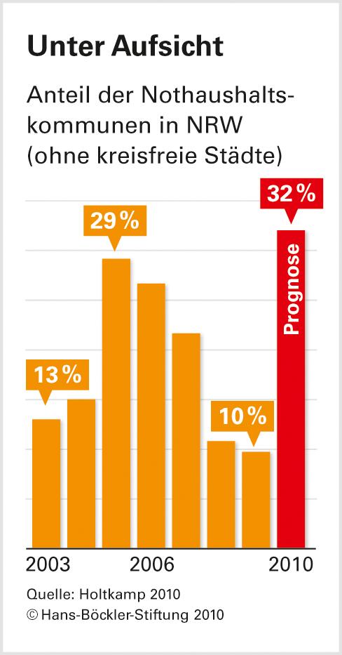 Nothaushalt als Massenphänomen. Ende 2006 befanden sich von den 427 Kommunen Nordrhein-Westfalens bereits 196 in der "Haushaltssicherung". Das heißt, sie müssen sich verpflichten, die Schulden in einem bestimmten Zeitraum, meist fünf Jahre, abzubauen und der Kommunalaufsicht ein entsprechendes Finanzkonzept vorlegen. Genehmigt die Aufsichtsbehörde den Sanierungsplan nicht, greift das Nothaushaltsrecht: Die betroffenen Städte und Gemeinden dürfen nur noch einen Bruchteil der geplanten Investitionen durchführen und keine neuen freiwilligen Aufgaben übernehmen. Ende 2006 galt das für 114, also mehr als ein Viertel der Kommunen in NRW. In den Folgejahren liegt die Quote zwar etwas niedriger, dies ist Holtkamp zufolge aber lediglich auf die Einführung neuer Buchungstechniken zurückzuführen. 2010 dürfte fast ein Drittel der Kommunen ins Nothaushaltsrecht rutschen.