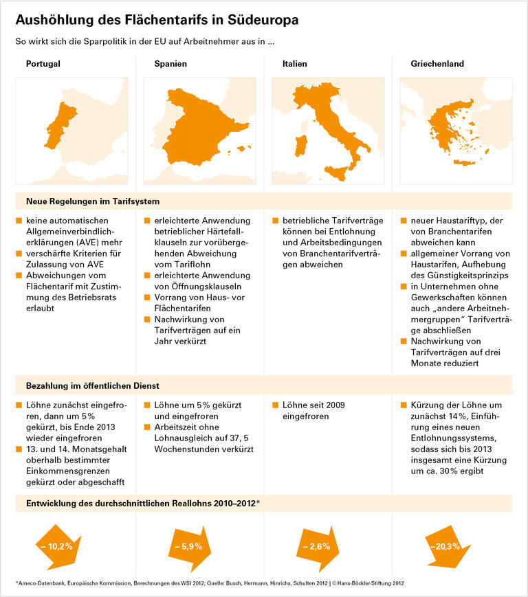 „In den nach wie vor stark klein- und mittelständisch geprägten Ökonomien Südeuropas“ werde dies zu einem drastischen Wandel der Lohnpolitik, einer rückläufigen Tarifbindung und schließlich einer „weitreichenden Individualisierung der Lohnverhandlungen“ führen, erwartet Schulten. Gleichzeitig wurden die Gehälter öffentlich Beschäftigter vielfach eingefroren, zum Teil auch gekürzt.