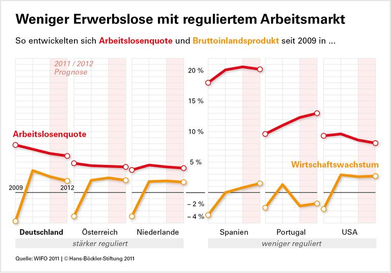 Gerade in Staaten wie Deutschland, Österreich und den Niederlanden, wo der wirtschaftliche Einbruch enorm, der Arbeitsmarkt aber relativ stabil war, erholte sich die Konjunktur bereits 2010, mit guten Prognosen für 2011, so die Autoren. Die Beschäftigung wird 2012 laut den Vorhersagen der OECD in allen drei Ländern höher sein als vor der Krise. In den Vereinigten Staaten, Spanien und Portugal hingegen, wo in der Krise viele Arbeitnehmer ihren Job verloren, bleibt die Arbeitslosigkeit hoch.