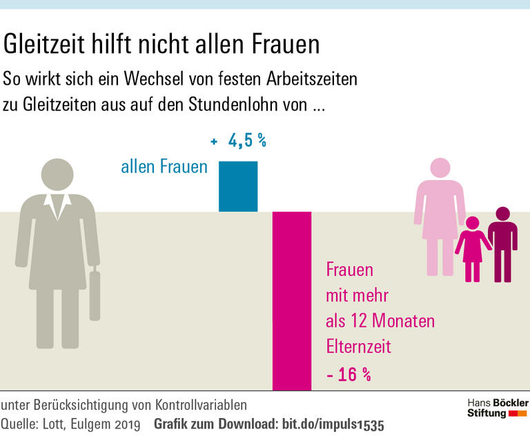 Als mögliche Gründe nennen die Forscherinnen zum einen den Verlust von „Humankapital“: Durch die längeren Auszeiten, die viele Frauen nach der Geburt nehmen, werde ihre Qualifikation entwertet. Zum anderen gebe es „negative Signalwirkungen“, weil viele Arbeitgeber Mutterschaft als Ausdruck fehlender Karriereorientierung betrachten. Zudem sei davon auszugehen, dass Vereinbarkeitsprobleme Stress verursachen und so die Produktivität beeinträchtigen. Flexible Arbeitszeiten wiederum könnten dabei helfen, Familie und Beruf unter einen Hut zu bekommen, so Lott und Eulgem. Insofern sollten sie eigentlich dazu beitragen, die Lohneinbußen von Frauen mit Kindern zu reduzieren. Tatsächlich hätten US-amerikanische Studien gezeigt, dass erwerbstätige Mütter von Gleitzeit finanziell profitieren.