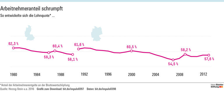 Diese Kennzahl gibt Aufschluss über die Leistungsfähigkeit der Arbeitslosenversicherung. Sie zeigt an, wie tief Arbeitnehmer – in finanzieller Hinsicht – fallen, wenn sie ihren Job verlieren. Infolge der Hartz-Gesetze ging die Lohnersatzquote zu Beginn des neuen Jahrtausends deutlich zurück. So „dürfte es zu einer Schwächung der Lohnverhandlungsposition der Arbeitnehmer gekommen sein“, schreiben die Wissenschaftler. Das Resultat lässt sich an der Lohnquote ablesen.