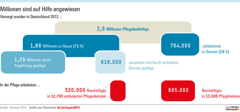 Gab es im Jahr 2013 rund 2,6 Millionen Pflegebedürftige in Deutschland, werden es 2030 nach Prognosen des Statistischen Bundesamtes weit mehr als drei Millionen sein. In der Altenpflege arbeitet derzeit etwa eine Million Menschen und es herrscht dramatischer Fachkräftemangel. Die Arbeit ist körperlich wie psychisch anstrengend und muss häufig unter so großem Zeitdruck erledigt werden, dass die Beschäftigten ihren eigenen professionellen Ansprüchen dabei nicht gerecht werden können. So scheidet die große Mehrheit der Pflegekräfte vorzeitig aus dem Beruf aus – frustriert und gesundheitlich angeschlagen.