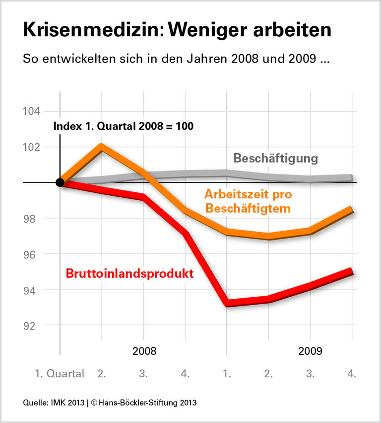 In der auf die Finanzkrise folgenden Rezession schrumpfte die deutsche Wirtschaft von Anfang 2008 bis Mitte 2009 um rund sieben Prozent. Entgegen den Erwartungen folgten darauf in Deutschland aber keine Massenentlassungen. Stattdessen arbeiteten die Beschäftigten weniger; ihre Stellen blieben so erhalten. Neben der vom Staat geförderten Kurzarbeit setzten die Unternehmen dabei auch auf andere Instrumente für interne Flexibilität. Wie Berechnungen des IMK auf Basis von Daten des Instituts für Arbeitsmarkt- und Berufsforschung (IAB) zeigen, ließen sich in der Krise so rund eine Million Jobs retten. Die zweite Welle der Krise, unter der jetzt die Euro-Krisenländer leiden, blieb daher hierzulande aus.