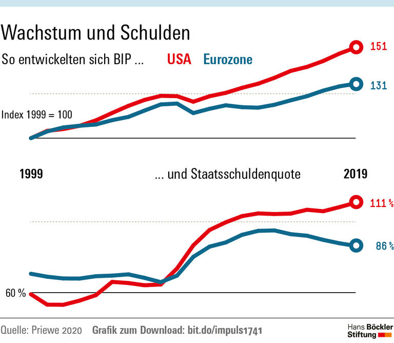 Dem Wissenschaftler zufolge steht hinter der Idee von Schuldengrenzen die Befürchtung, dass die Verschuldung irgendwann außer Kontrolle geraten könnte. Die Veränderung des Schuldenstands hänge vor allem von der Differenz zwischen der Wachstumsrate des BIP und dem Zins auf Staatsschulden ab. Sind die Zinsen niedriger als die Wachstumsrate, könne der Schuldenstand trotz dauerhafter Defizite durchaus stabil bleiben. So sei es beispielsweise in den USA seit den 1950er-Jahren meistens gewesen. In der Eurozone, deren Regelwerk eine systematische Schlagseite zur Sparpolitik habe, sei das Gegenteil der Fall gewesen. Sie leidet laut Priewe darunter, dass die ständigen Bemühungen um einen niedrigen Schuldenstand und die Vorschriften über ausgeglichene Staatshaushalte in konjunkturell normalen Zeiten, in denen das sogenannte strukturelle, also konjunkturunabhängige Defizit ein halbes Prozent in der Regel nicht überschreiten darf, Wachstum und Beschäftigung dämpfen. Die Wachstumsrate blieb häufig unter dem Zinssatz.