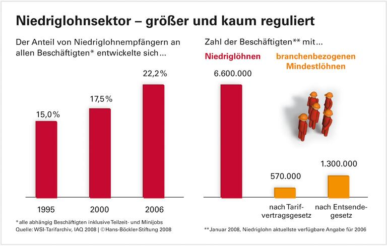 Viele Menschen in Deutschland arbeiten für wenig Geld. Einen Niedriglohn erhalten 6,6 Millionen, das sind 22,6 Prozent aller Beschäftigten. Forscher der Uni Duisburg-Essen ermittelten dies anhand der OECD-Niedriglohn-Definition: ein Arbeitsentgelt von weniger als zwei Drittel des mittleren Lohns. Die Bundesregierung plant nun, die Einführung branchenbezogener Mindestlöhne zu erleichtern - mittels einer Ausweitung des Entsendegesetzes und einer Reaktivierung des Mindestarbeitsbedingungengesetzes. "Eine genaue Analyse der vorgeschlagenen Verfahren macht jedoch deutlich, dass hierbei große Teile des Niedriglohnsektors nicht erfasst werden", erklären Reinhard Bispinck und Thorsten Schulten vom WSI. Ein branchenübergreifender Mindestlohn könne Lücken schließen.