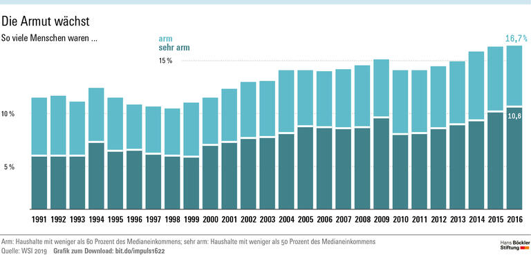 Der Untersuchung zufolge haben die oberen Einkommensgruppen in den vergangenen Jahren von sprudelnden Kapital- und Unternehmenseinkommen profitiert und dadurch die große Mehrheit der Haushalte deutlich hinter sich gelassen. Gleichzeitig ist der Anteil der Haushalte, die weniger als 60 Prozent des mittleren Einkommens zur Verfügung haben und damit nach gängiger Definition als arm gelten, gewachsen – von 14,2 Prozent 2010 auf 16,7 Prozent 2016. Auch die sogenannte „Armutslücke“ hat sich vergrößert. Sie zeigt an, welches jährliche Einkommen einem durchschnittlichen armen Haushalt fehlt, um es über die Armutsschwelle von 60 Prozent zu schaffen. Inflationsbereinigt hat sich dieser Fehlbetrag von 2005 bis 2011 von 2873 auf 2673 Euro verringert, seitdem ist wieder angestiegen, bis 2016 um 29 Prozent auf 3452 Euro. Das hat Spannagel zufolge auch damit zu tun, dass im aktuellen Aufschwung – anders als in den 2000er-Jahren – nicht nur die oberen, sondern auch die mittleren Einkommen stärker zugelegt haben: Viele Haushalte in der Mitte gewannen durch steigende Löhne und mehr Beschäftigung hinzu. Ein positiver Trend, von dem im unteren Bereich der Einkommensverteilung aber wenig bis nichts ankam: Das unterste Zehntel hat zwischen 2010 und 2016 nach Abzug der Inflation sogar Einkommen verloren. In den drei Zehnteln darüber waren die Zuwächse unterdurchschnittlich.
