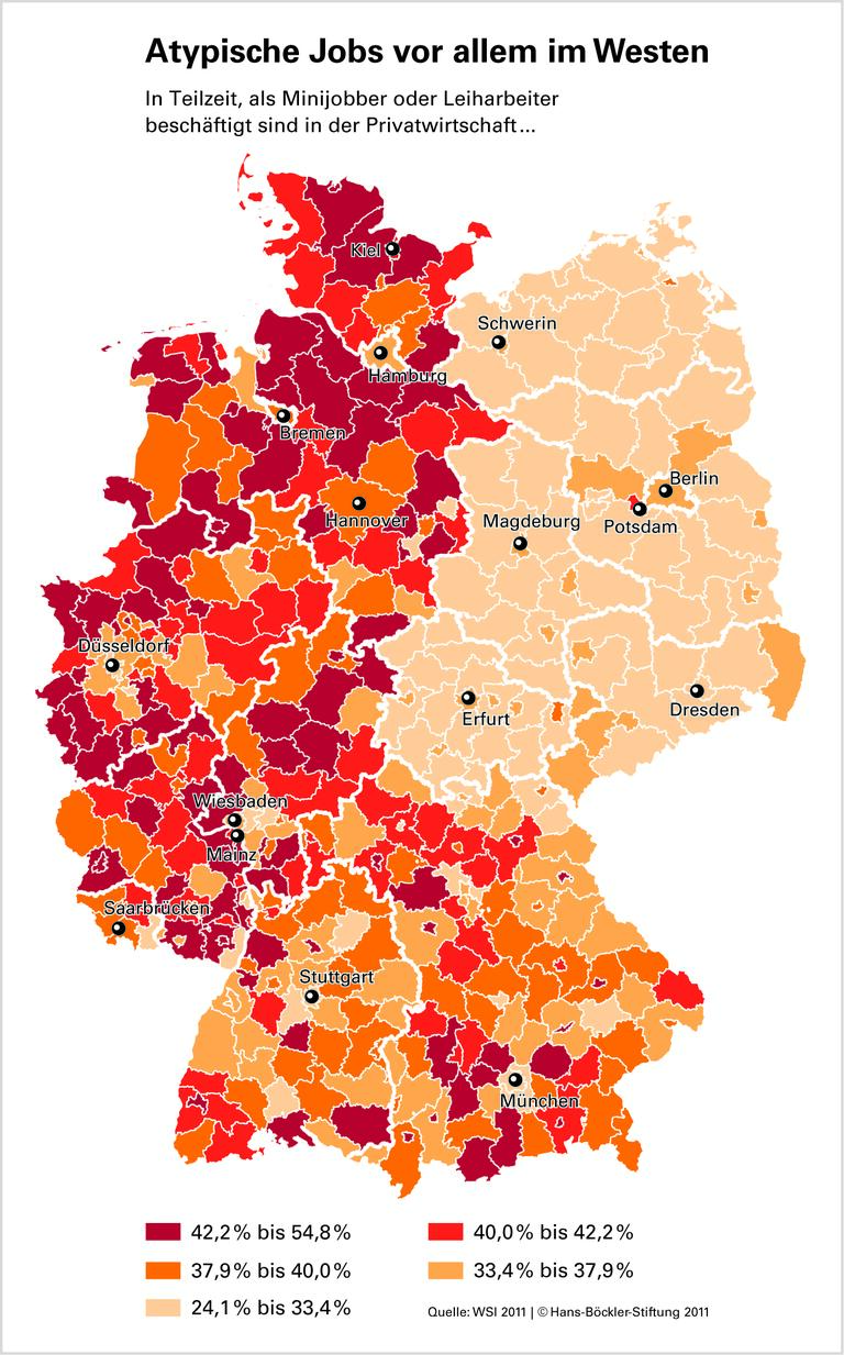 Die WSI-Datenbank ermöglicht einen detaillierten Blick auf die Entwicklung der atypischen Beschäftigung in einzelnen Städten und Landkreisen. Hier zeigt sich: In einigen ländlichen Regionen Westdeutschlands machen Leiharbeit, Minijobs und Teilzeit fast die Hälfte der Beschäftigungsverhältnisse aus. Zwar kommt es in der Statistik zu Überschneidungen, wenn Leiharbeitnehmer in Teilzeit arbeiten. Doch die dürften eher gering sein: Leiharbeit ist eine männlich dominierte Beschäftigungsform, gleichzeitig arbeiten Männer selten in Teilzeit.