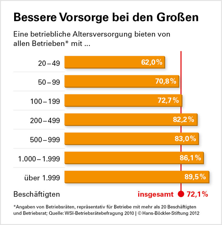 Keine flächendeckende Absicherung. Der Untersuchung liegen Angaben aus knapp 2.000 Betrieben mit Betriebsrat zugrunde. Sie ist repräsentativ für mitbestimmte Betriebe ab 20 Beschäftigten. 72 Prozent davon machen ihren Mitarbeitern Angebote zur betrieblichen Altersversorgung. Besteht ein Angebot zur Entgeltumwandlung, geben die Betriebsräte im Durchschnitt an, dass dieses von knapp 40 Prozent der Beschäftigten auch genutzt wird. Bezogen auf die Gesamtheit der befragten Betriebe – inklusive derjenigen ohne Angebot – liegt die Nutzungsquote nur bei 23 Prozent.