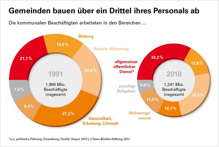 Von 1991 bis 2010 ist die Zahl der Staatsbediensteten um 1,6 Millionen gesunken; das sind über 30 Prozent. Knapp die Hälfte des Stellenabbaus folgte daraus, dass der Staat Wirtschaftsunternehmen wie die Bahn oder die Post, Krankenhäuser und Hochschulen zunehmend aus den Kernhaushalten ausgliederte. Bereinigt um diese Verschiebungen liegt der Rückgang bei 18 Prozent. Die Bundeswehr baute mit dem Ende des Kalten Krieges in starkem Maße Personal ab. Unter Berücksichtigung dieser „Friedensdividende“ sank die Zahl der Beschäftigten aber immer noch um 11 Prozent. Gegenwärtig sind rund 6,6 Prozent aller Einwohner im öffentlichen Dienst beschäftigt. Im Vergleich zu den Ländern des Euroraums liegt Deutschland damit inzwischen unter dem Durchschnitt.