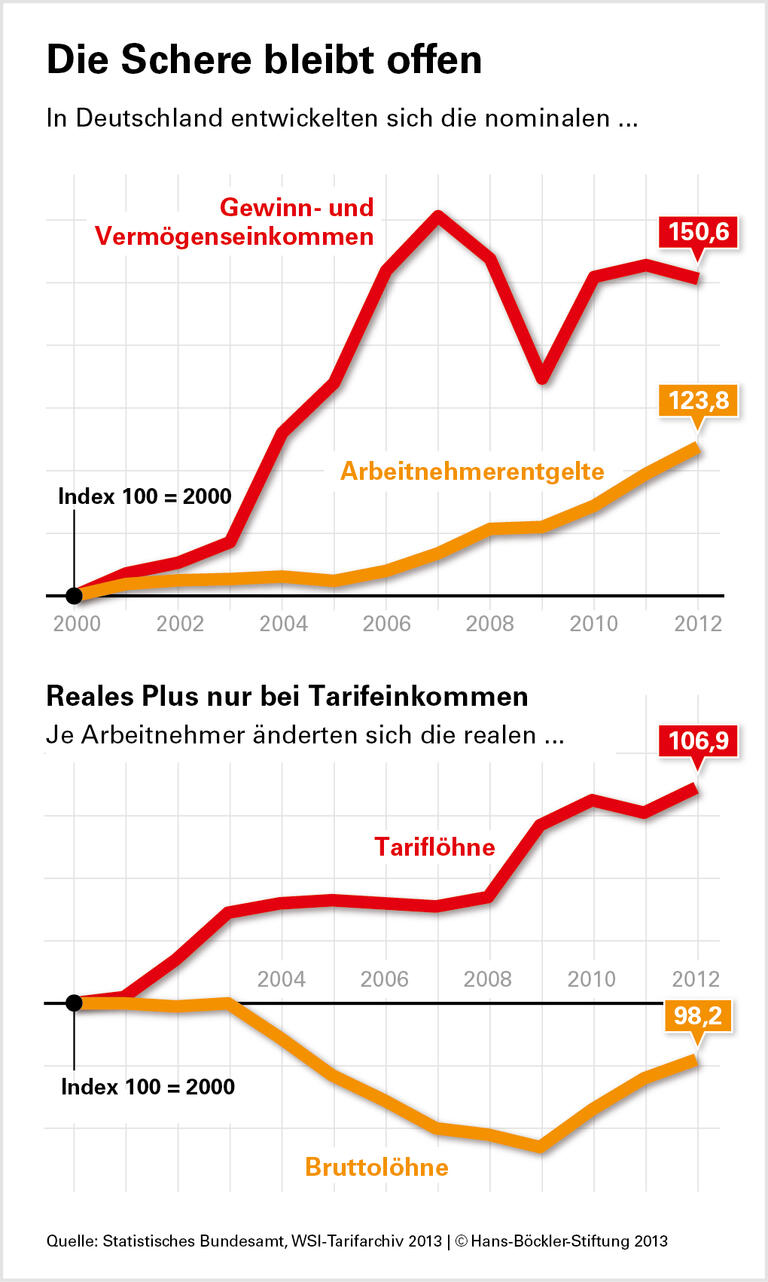 Die Einkommen aus Vermögen und Unternehmensgewinnen haben die Arbeitseinkommen seit der Jahrtausendwende deutlich hinter sich gelassen, zeigen die WSI-Daten: Zwischen 2000 und 2012 legten sie nominal um rund 50 Prozent zu, trotz eines zwischenzeitlichen Einbruchs in der Wirtschaftskrise 2009. Die nominalen Arbeitnehmerentgelte wuchsen dagegen nur um knapp 24 Prozent. Zuletzt ist auch hier der Abstand etwas kleiner geworden: Die Löhne machten Boden gut, die Kapitaleinkommen leiden unter der momentanen Zinsschwäche. Gleichwohl bleibe die Schere noch weit geöffnet, und das sei schlecht für die Entwicklung in Deutschland und Europa, betont WSI-Experte Bispinck: „Wir sehen derzeit deutlich, wie wichtig eine solide Binnennachfrage für unsere wirtschaftliche Stabilität ist. Eine deutliche Stärkung der Massenkaufkraft durch höhere Löhne ist dafür unverzichtbar.“