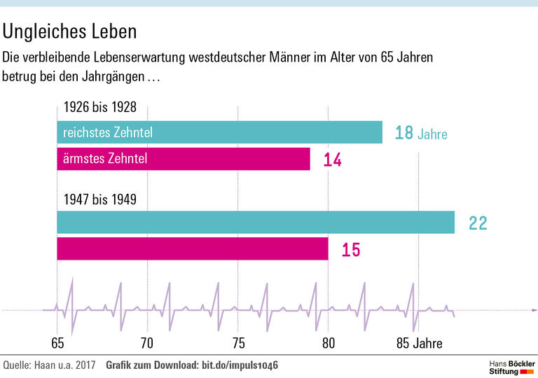Vor dem Tod sind nicht alle gleich: Männer sterben im Schnitt früher als Frauen, Raucher früher als Nichtraucher und Sporthasser früher als Athleten. Dass auch die wirtschaftliche Situation eine Rolle spielt, zeigt eine Studie von Peter Haan, Daniel Kemptner und Holger Lüthen. Die Ökonomen vom Deutschen Institut für Wirtschaftsforschung (DIW) können nachweisen, dass Reiche deutlich älter werden als Arme – und damit auch deutlich länger Rente beziehen. Die soziale Unwucht hat über die Generationen zugenommen.