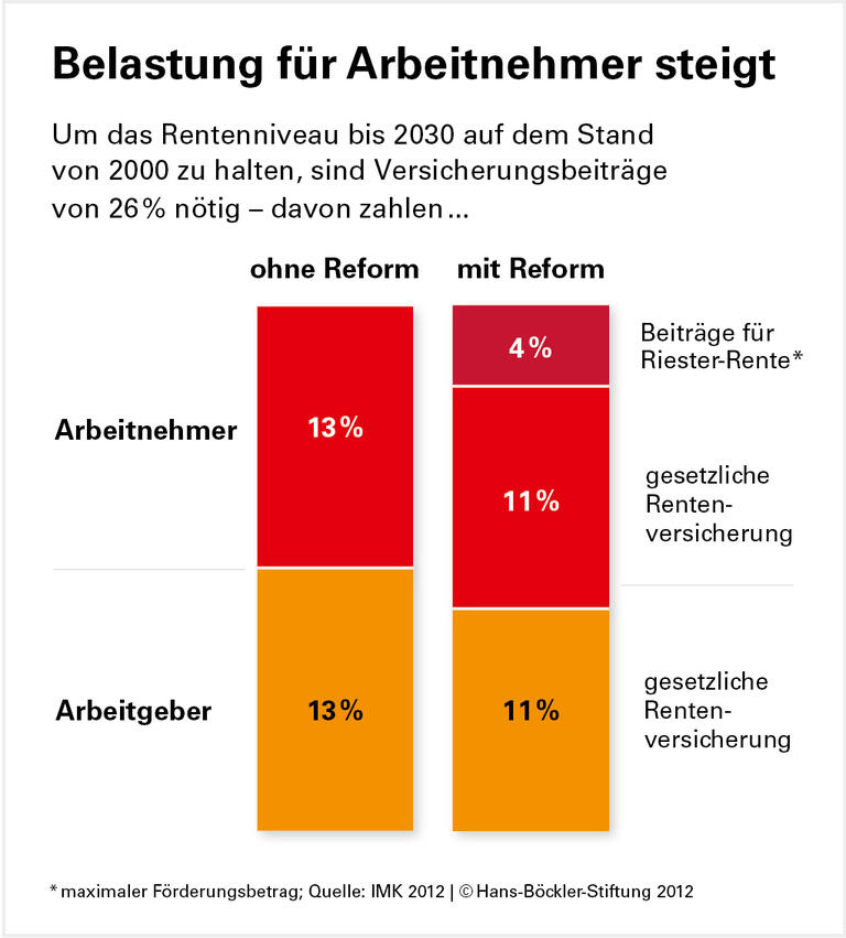 Hohe Belastung, mäßige Beteiligung. Mit Einführung der kapitalgedeckten Zusatzvorsorge steigen nach den Berechnungen der Wissenschaftler die finanziellen Aufwendungen markant, die Arbeitnehmer für die Altersvorsorge tragen sollen. Denn Riester-Sparer erhalten zwar einen moderaten staatlichen Zuschuss. Anders als im gesetzlichen Alterssicherungssystem leisten die Arbeitgeber aber keinen Beitrag. So müssen Beschäftigte längerfristig 15 Prozent ihres Bruttoeinkommens für ihre Altersvorsorge aufwenden: 11 Prozent als hälftigen Beitragssatz zur gesetzlichen Rentenversicherung und 4 Prozent für die private Vorsorge. Ohne Riester-Reform wäre der Beitragssatz nach wissenschaftlichen Prognosen bis 2030 auf rund 26 Prozent gestiegen. Die – hälftige – Belastung für die Arbeitnehmer läge also bei nur 13 Prozent.